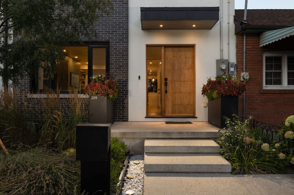 The exterior of this custom designed home features contemporary brick and stucco as well as an awning over the front door with pot lights & cedar ceiling