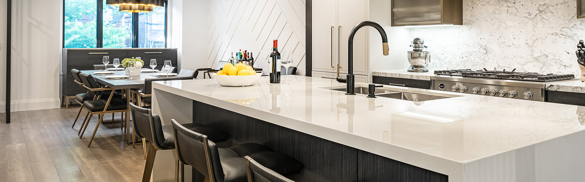 - The oversized centre island with solid white Quartz countertop features two overhead pendant lights and a full-size stainless steel undermount sink featuring arc dual-mode pull-down faucet & built-in soap dispenser